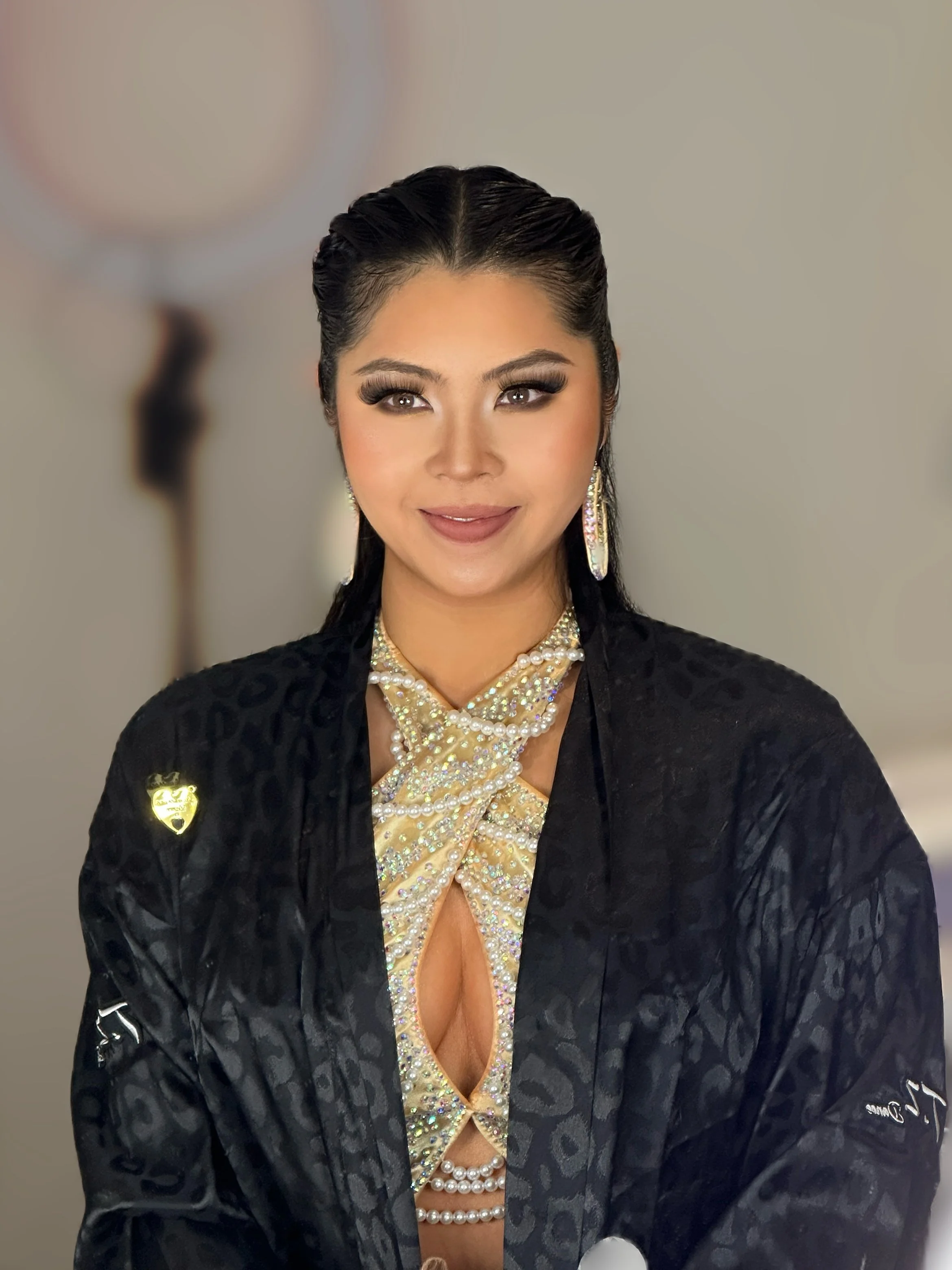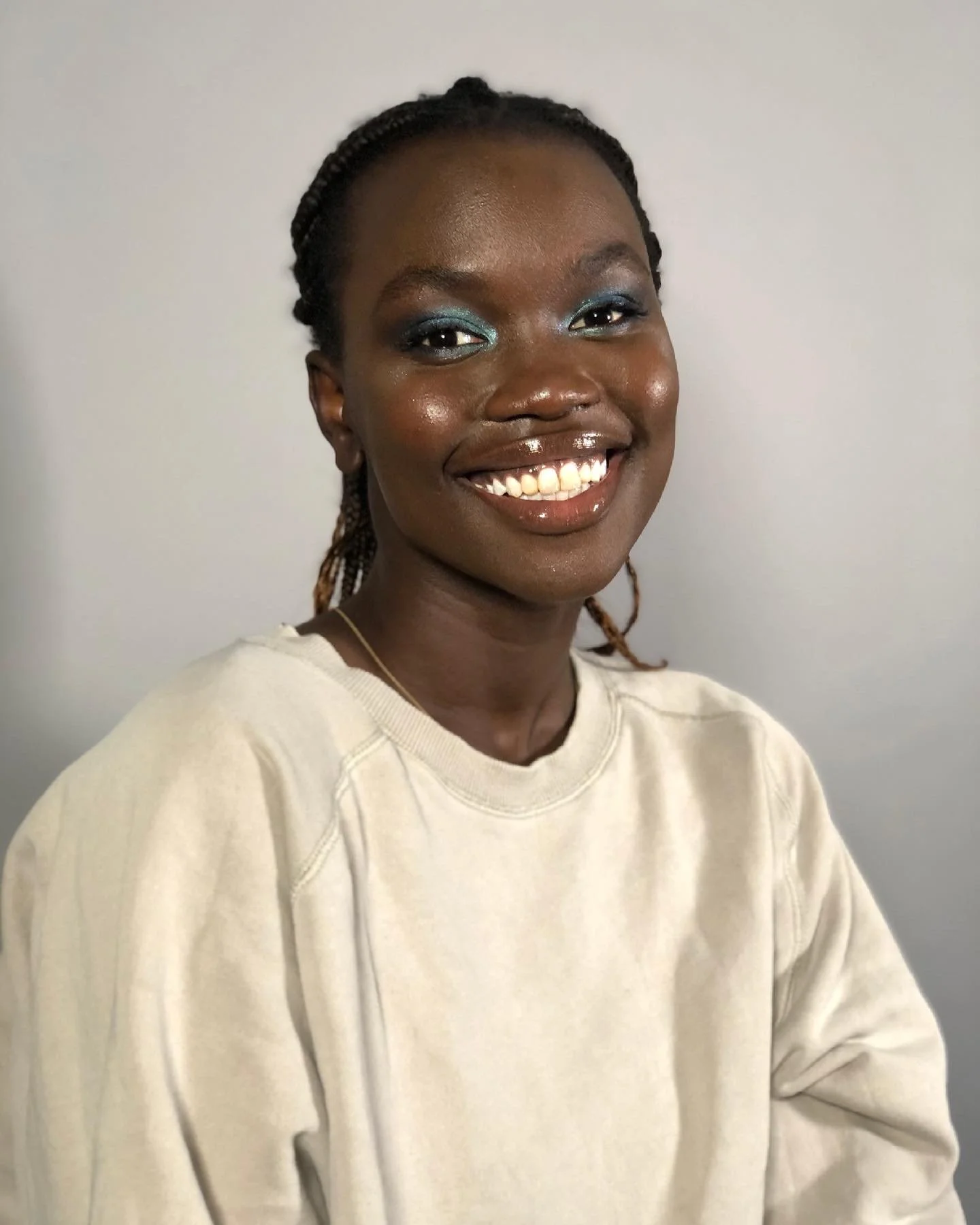 Young woman with styled hair, dramatic makeup, wearing a beige Adidas sweatshirt and earrings, smiling at the camera.