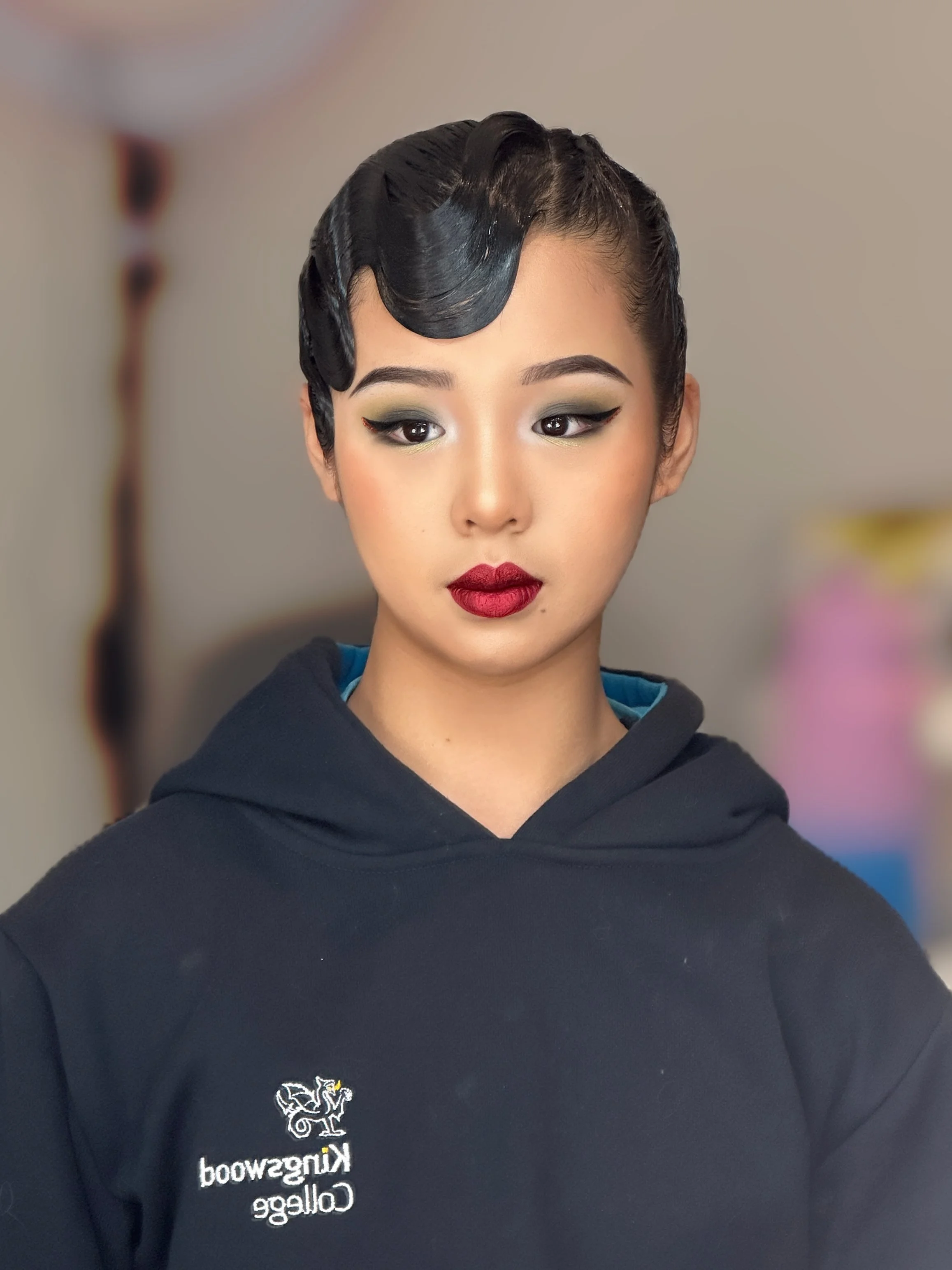 Woman with vintage hairstyle, makeup with red lipstick, wearing a black hoodie with a logo and text that reads 'Kingswood College'.