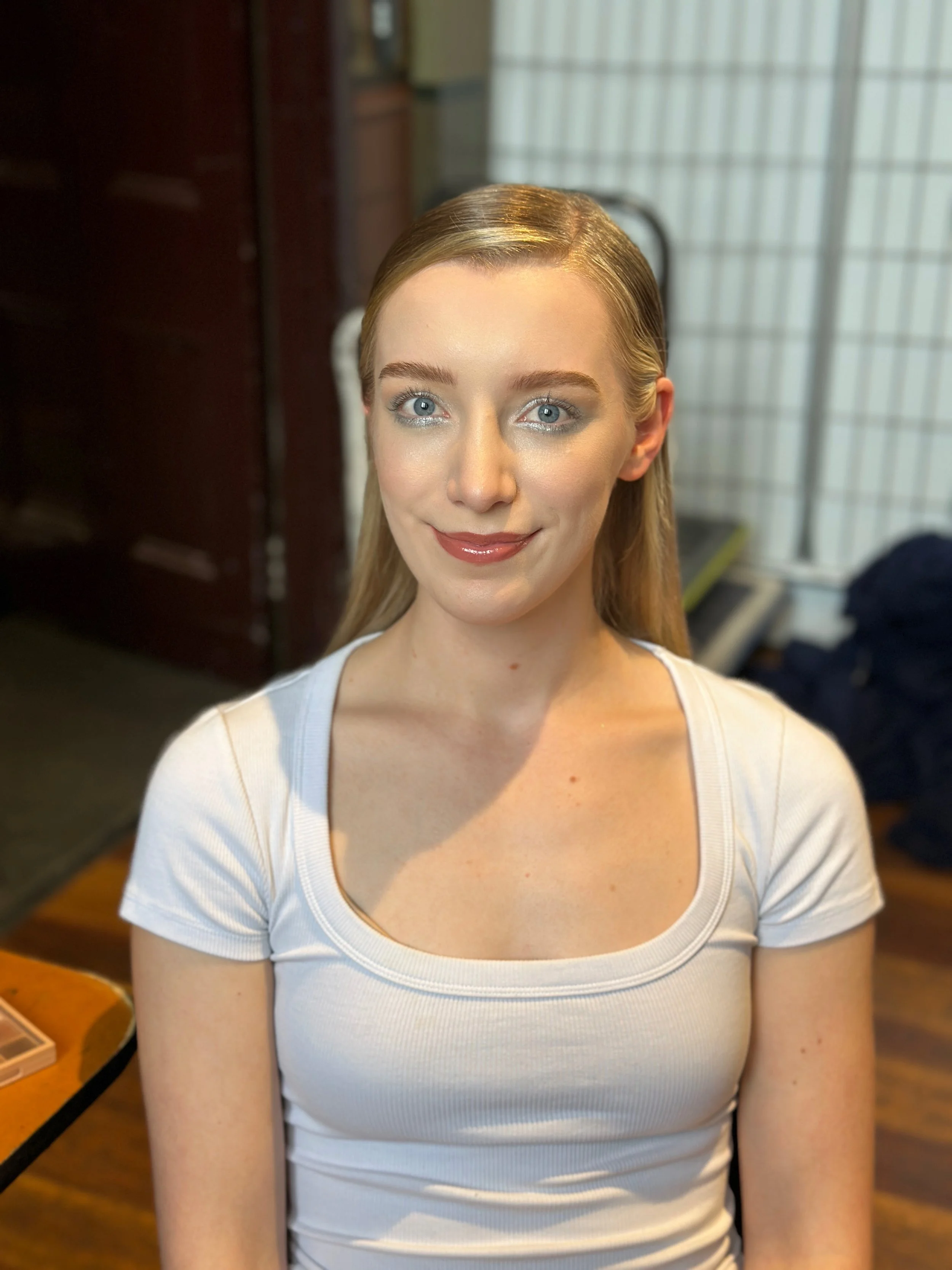 A young woman with brown hair, blue eyes, and makeup, smiling at the camera, wearing a white top with buttons.