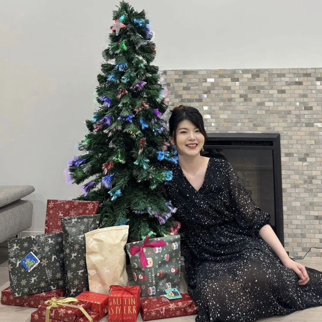 A woman in a black dress with white speckles sitting on the floor next to a decorated Christmas tree with wrapped presents underneath.