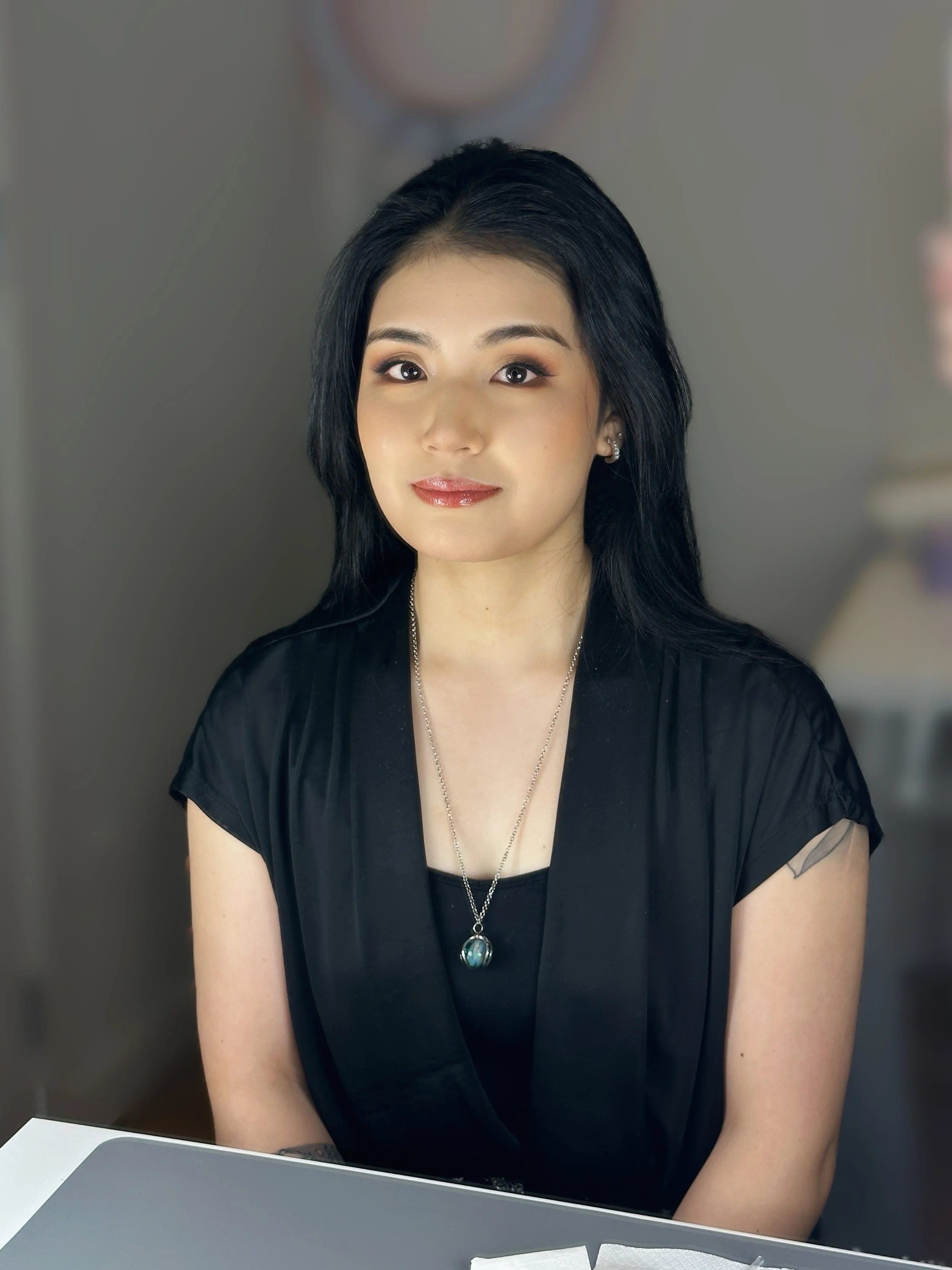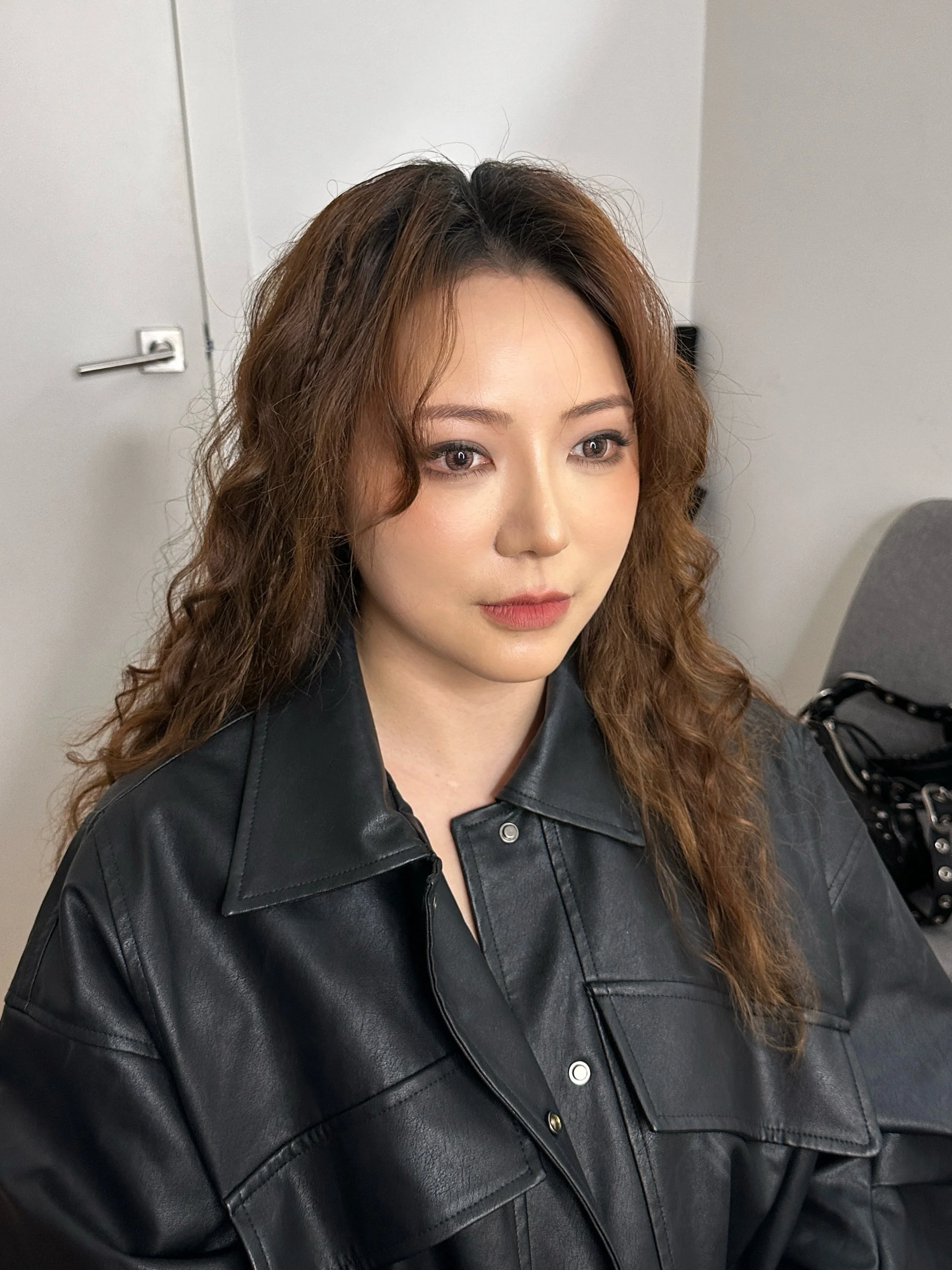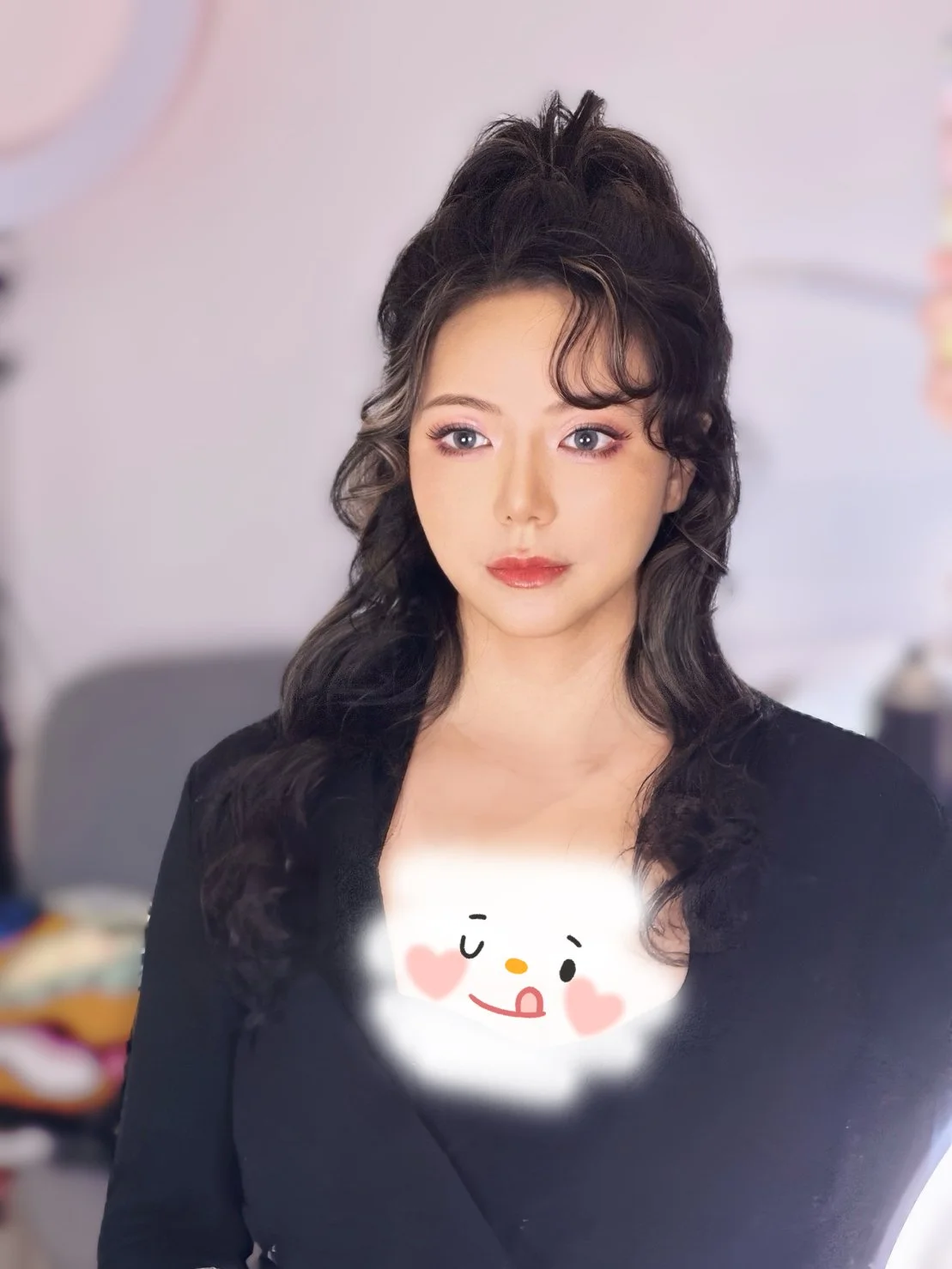 A young woman with long dark hair styled in loose waves, wearing makeup with prominent eyelashes and lips, dressed in a black zip-up jacket, standing indoors with a blurred background that includes a lamp.