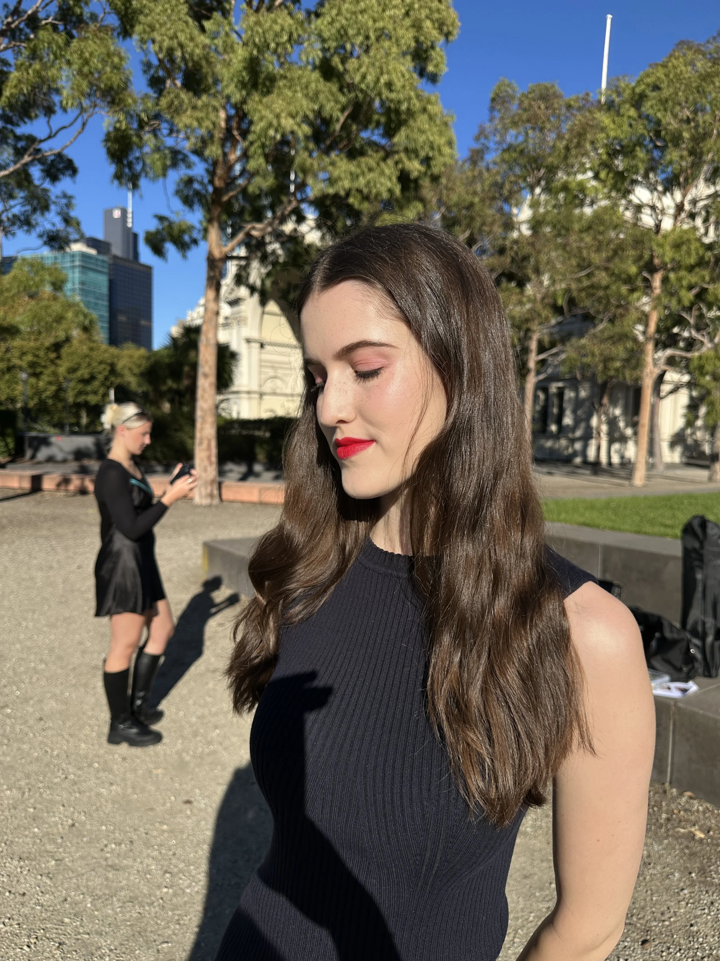 Woman with her eyes closed, wearing dark makeup, red lipstick, and a black top, with her hair styled in a braided updo.