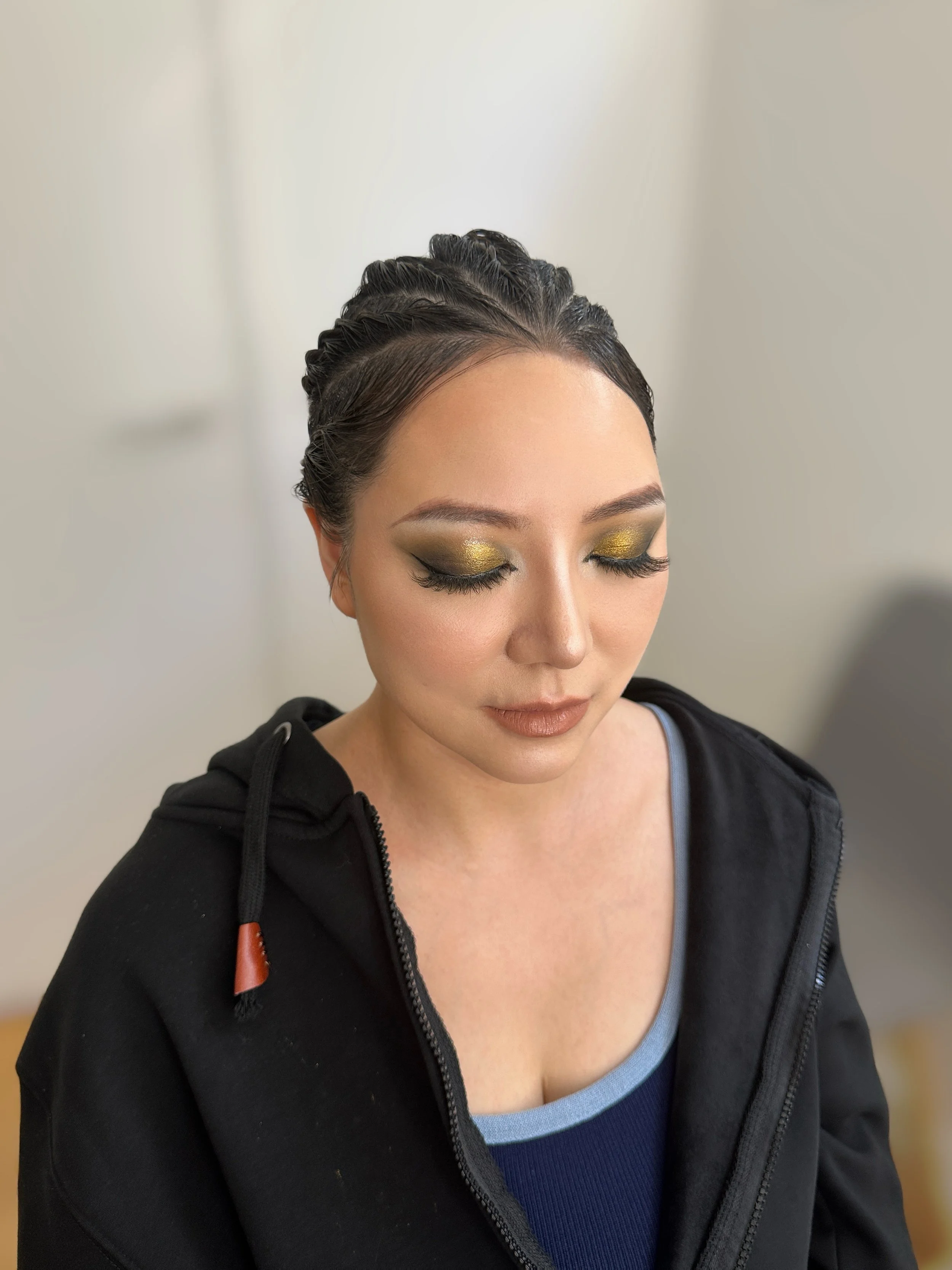 A woman with closed eyes wearing gold and black eyeshadow, long false eyelashes, and nude lipstick, dressed in a black zip-up hoodie over a blue top.