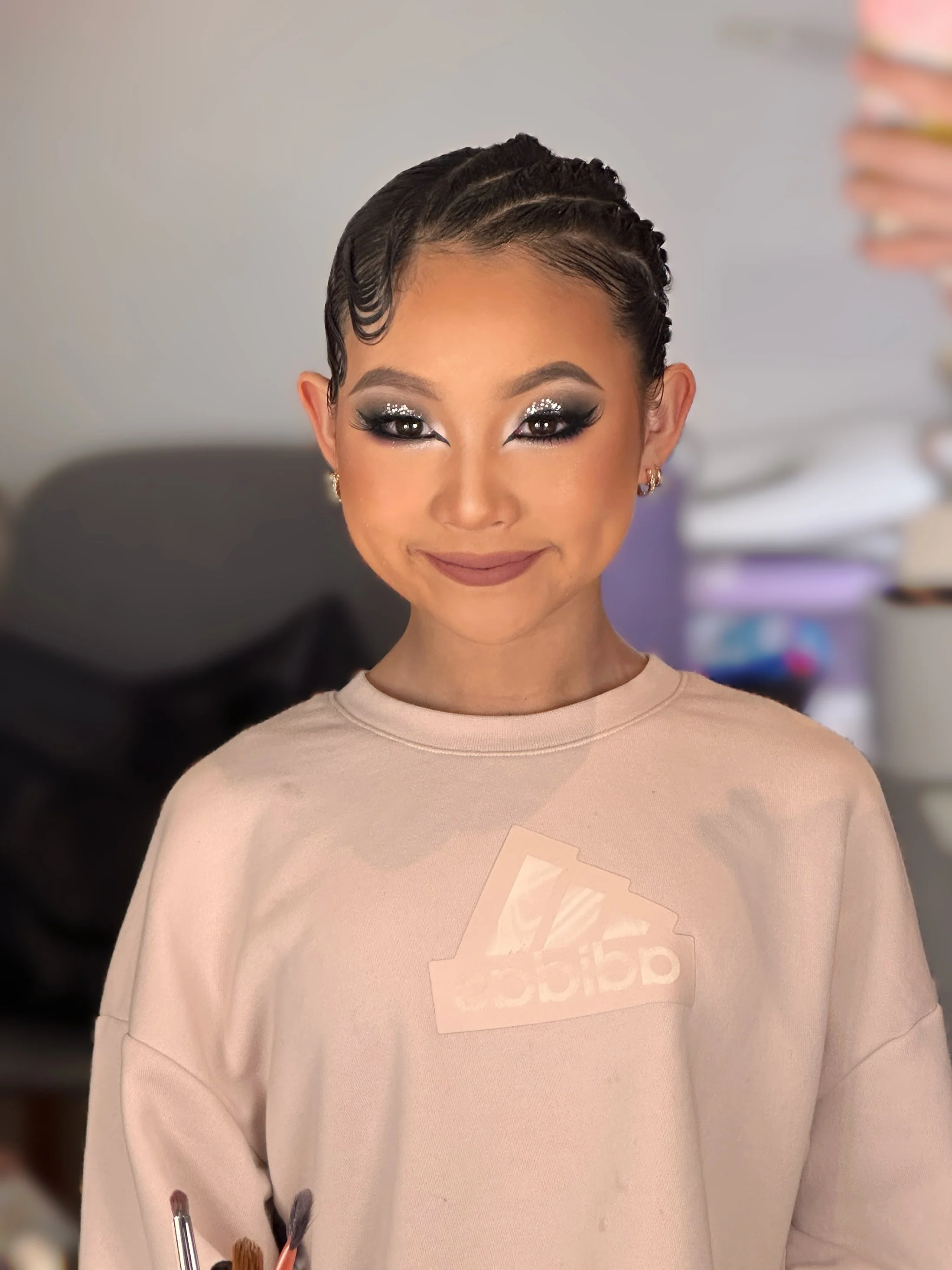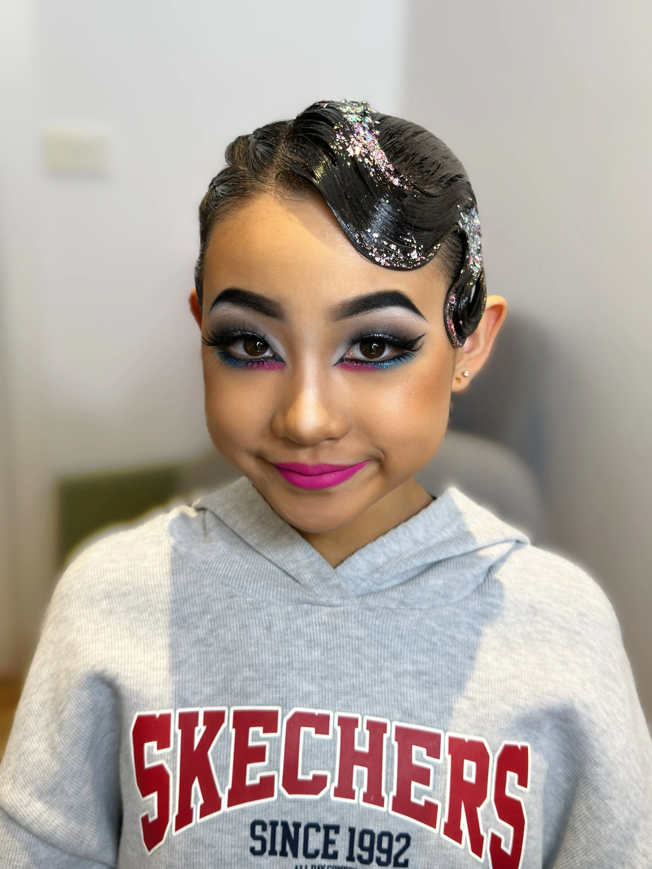 A young girl with styled black hair decorated with glitter, wearing colorful eye makeup and bright pink lipstick, smiling and wearing a gray Skechers hoodie.