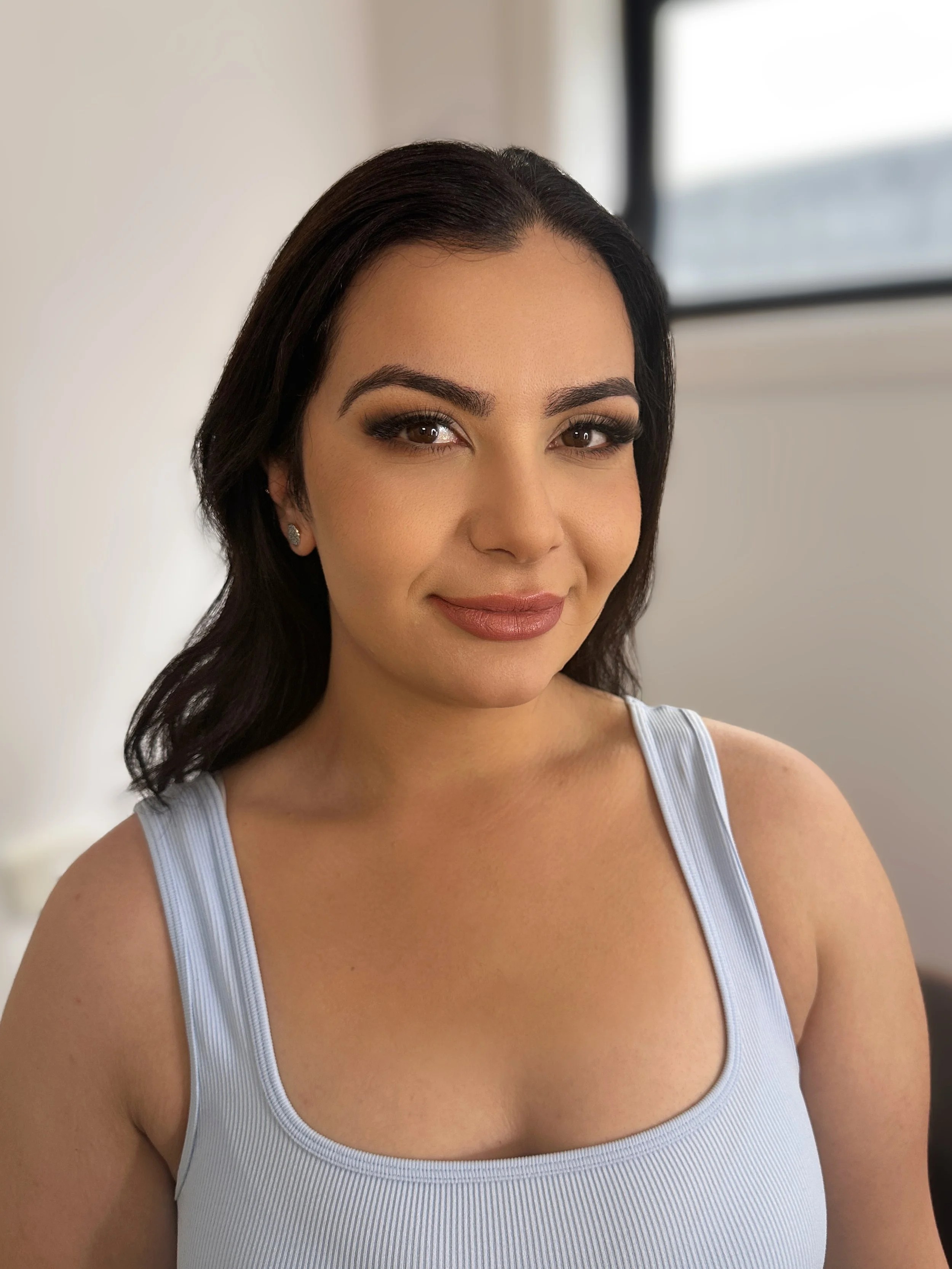 A woman with dark hair, makeup, and earrings, wearing a light-colored sleeveless top, smiling indoors near a window.