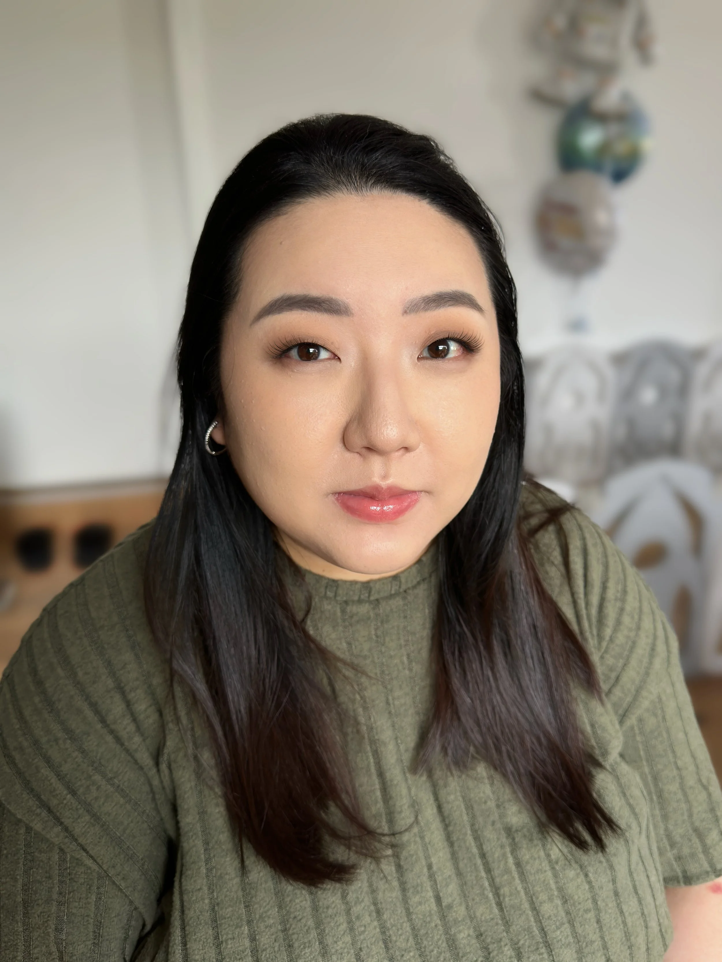A woman with long dark hair and light makeup, smiling, wearing a brown sleeveless top, sitting in a room with makeup supplies visible on a nearby table.