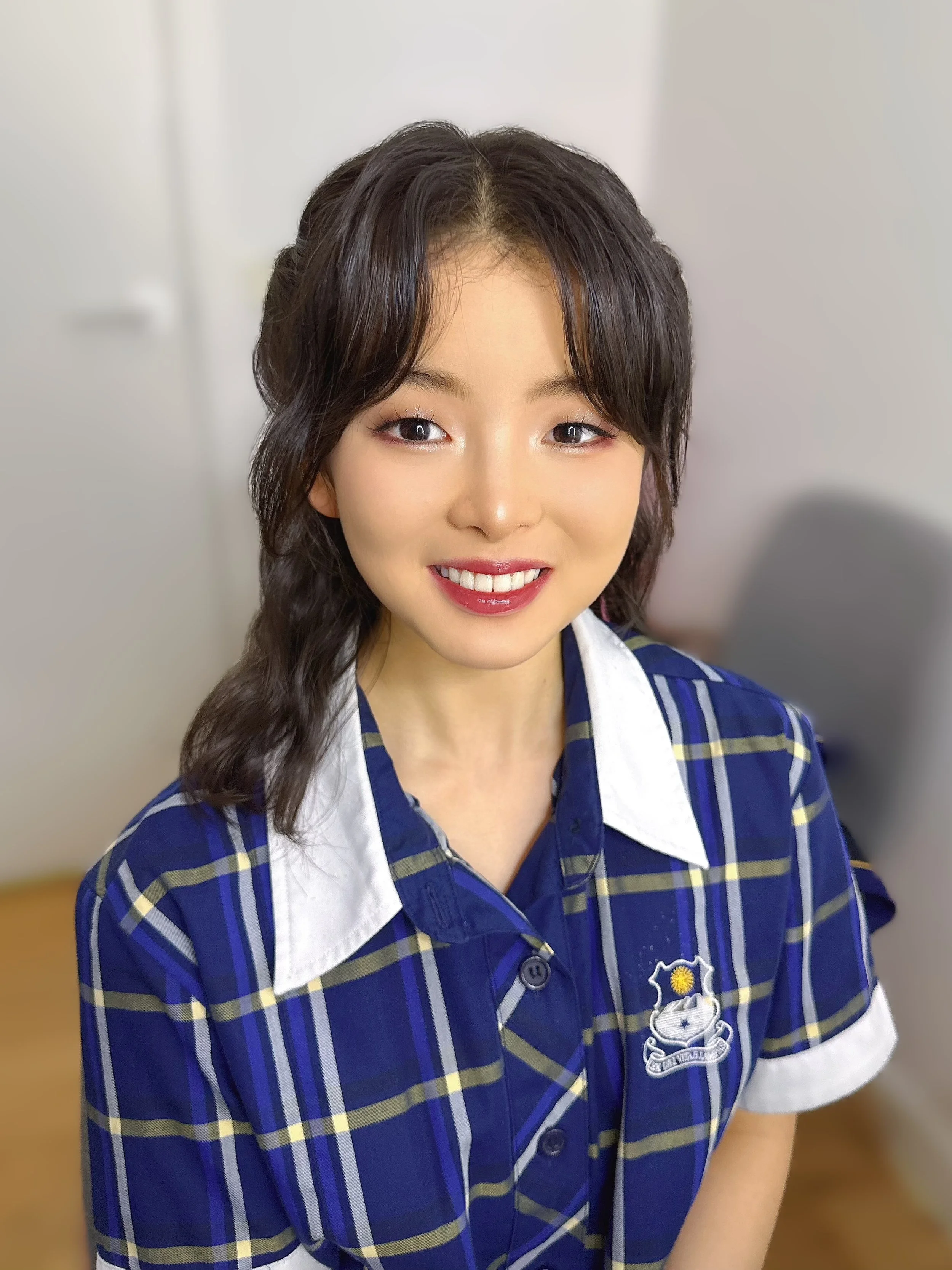 A young woman with shoulder-length dark brown hair styled in loose waves, wearing a blue plaid school uniform shirt with a white collar and a school crest badge, smiling at the camera in an indoor setting.