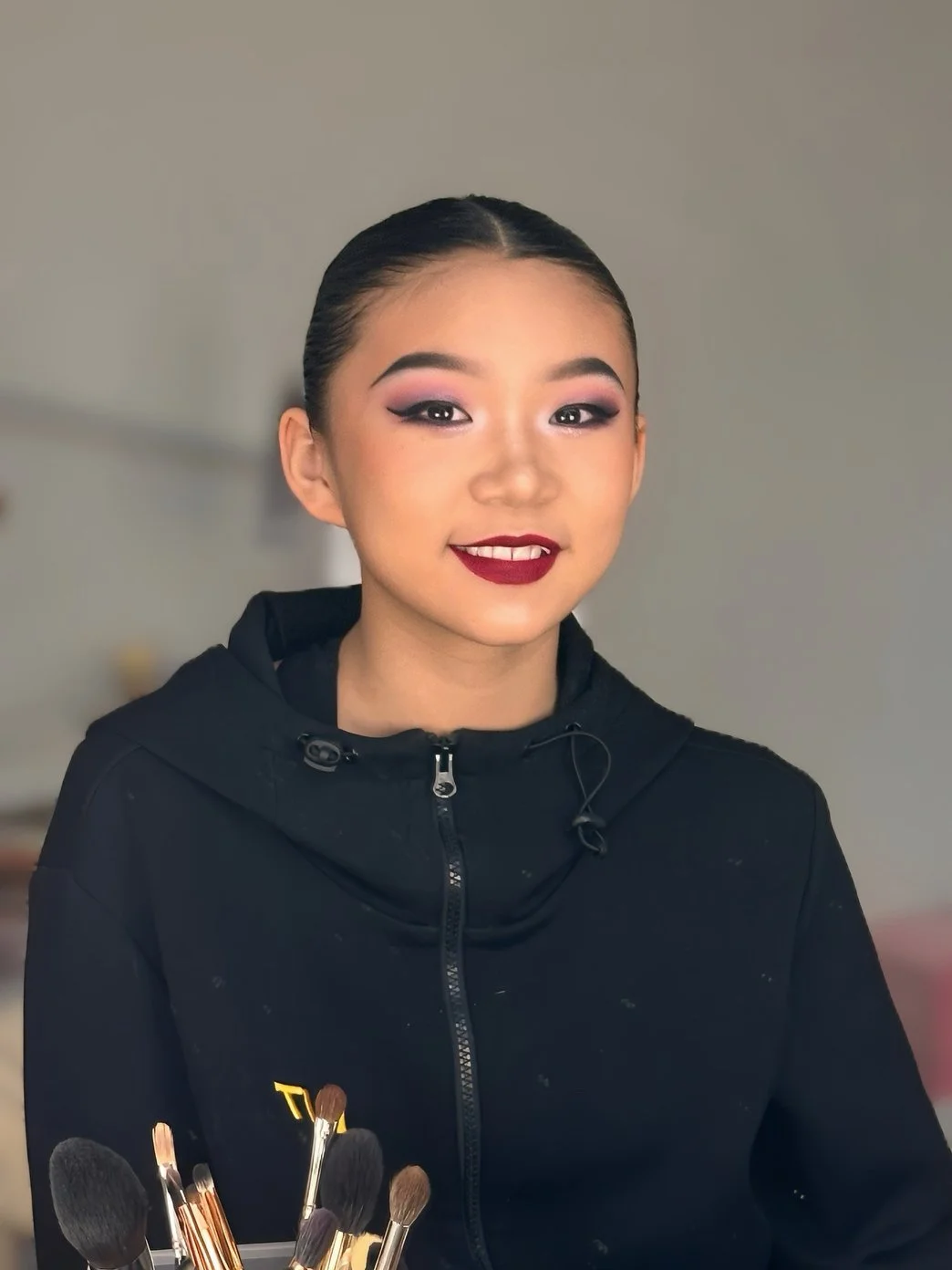A young girl with elaborate eye makeup, smiling, in a fluffy gray zip-up jacket, standing behind a table of makeup brushes and tools.
