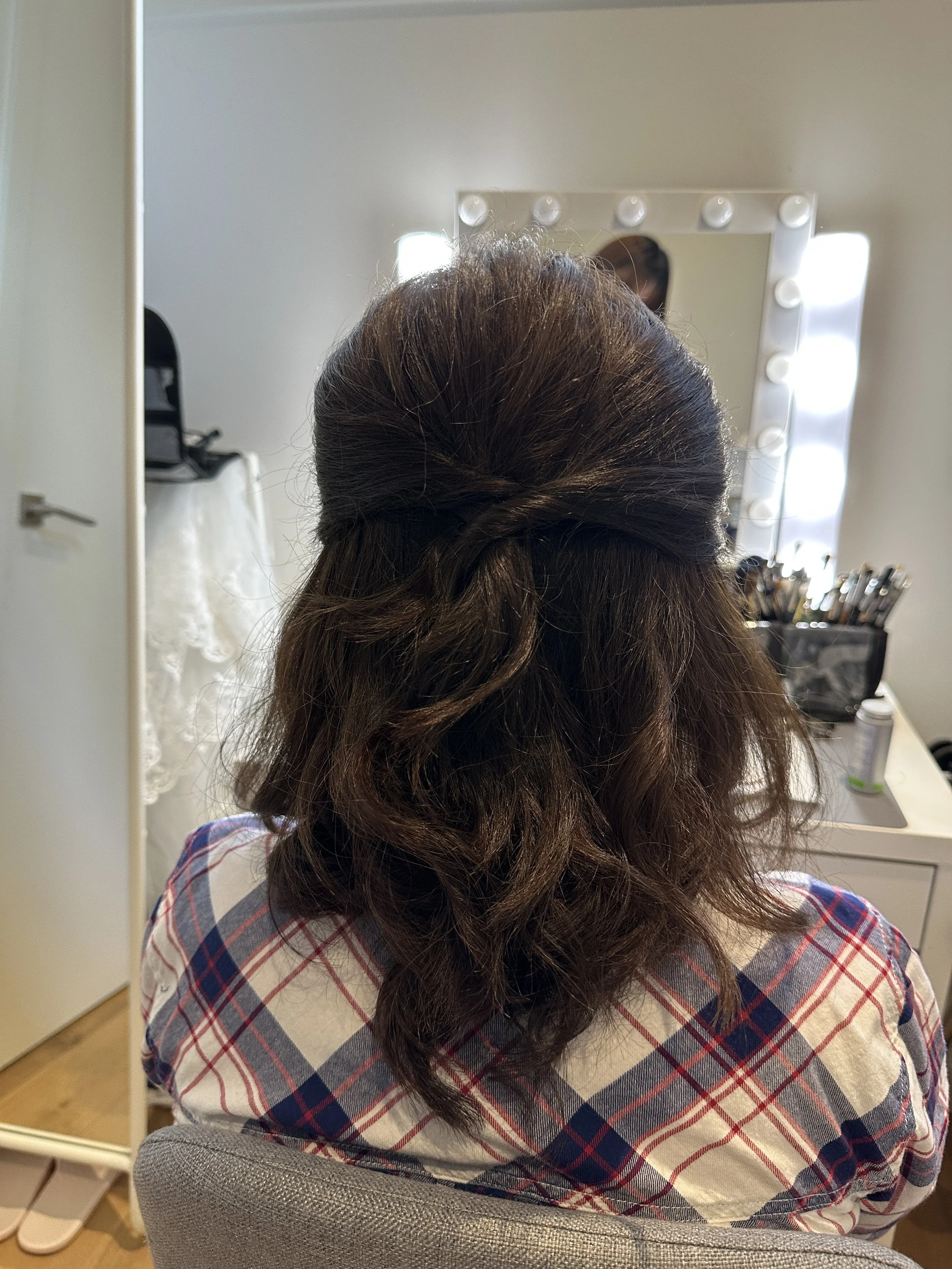 Back view of a woman with shoulder-length dark brown hair styled in loose curls and a partial braided crown, sitting in a salon chair with a pink shirt, in front of a salon work station with tools and hair products.