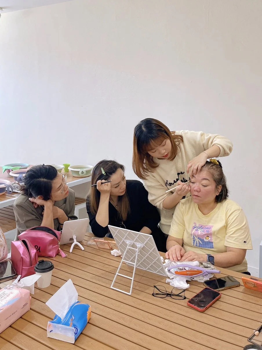 A woman is receiving a makeup application from a professional makeup artist while three others observe, seated at a wooden table with various makeup and personal items.