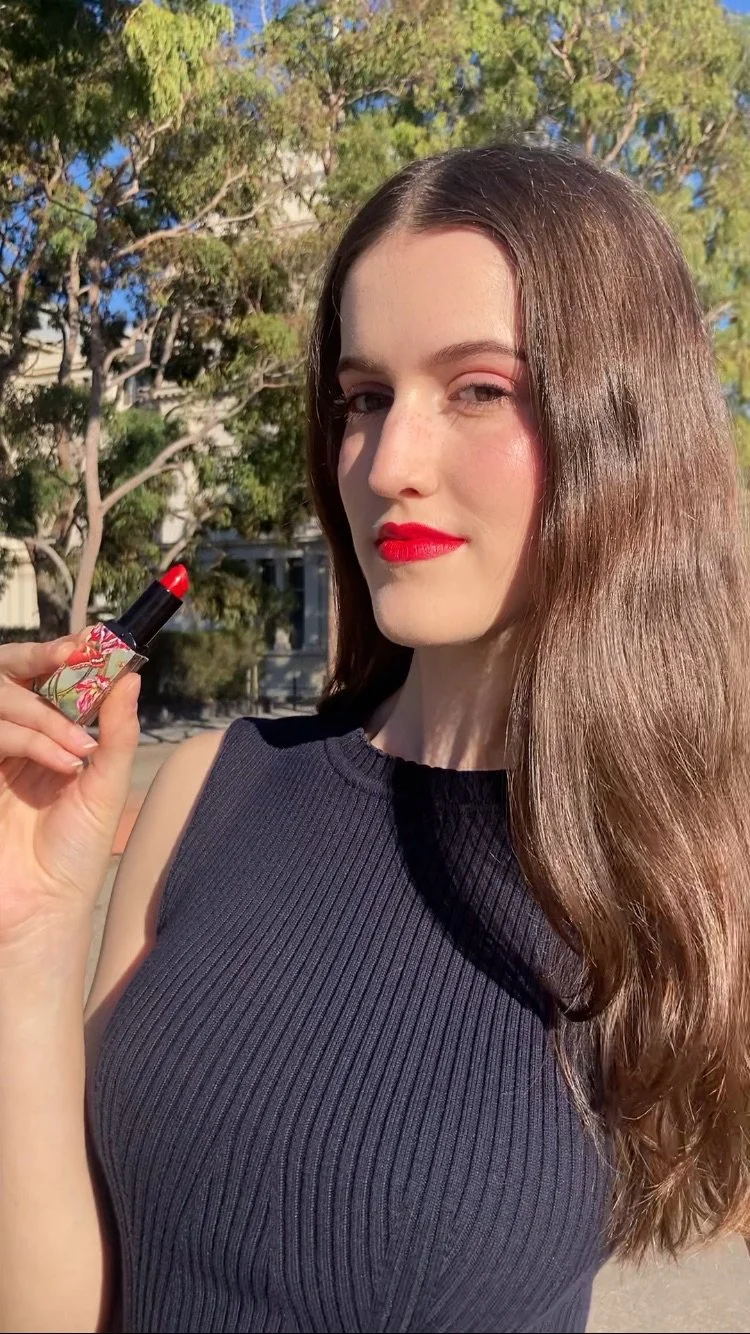 A woman with long brown hair and red lipstick holds a lipstick tube outdoors, with trees and a sunny sky in the background.
