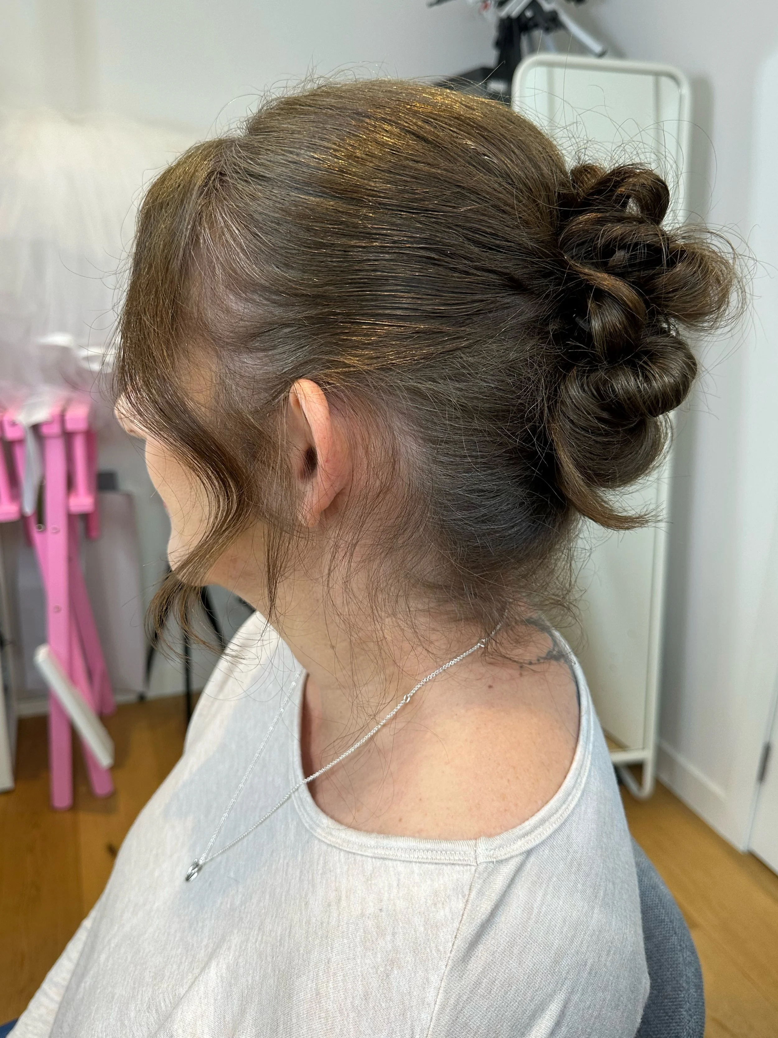 Side view of a woman with brown hair styled in an elegant updo with curls, wearing a silver necklace, and sitting in a salon or studio.