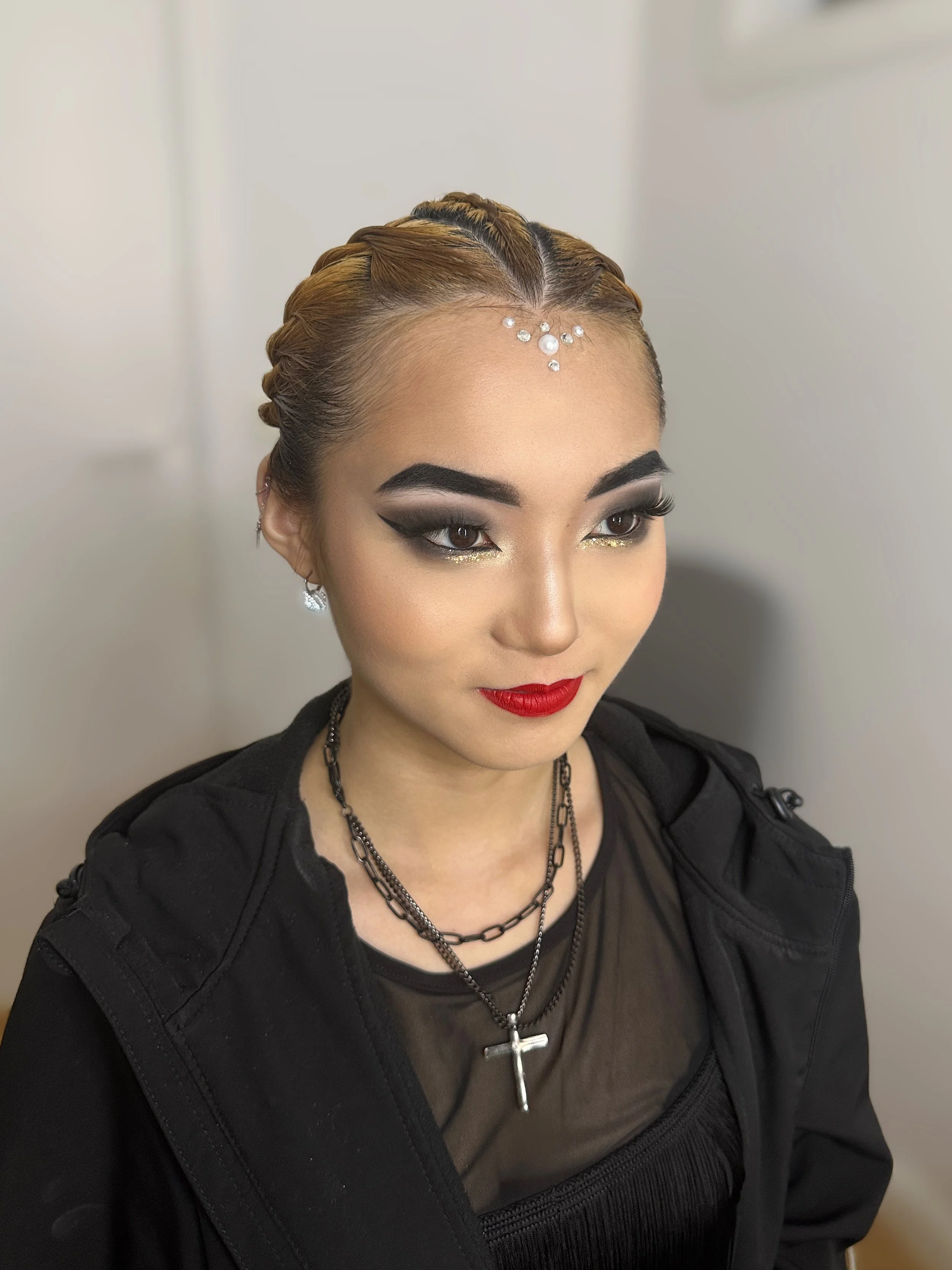 A woman with braided hair, wearing makeup with bold eyeliner, gold eyeshadow, red lipstick, and rhinestones on her forehead. She is dressed in black with layered necklaces, including a cross pendant, and earrings, standing against a plain background.