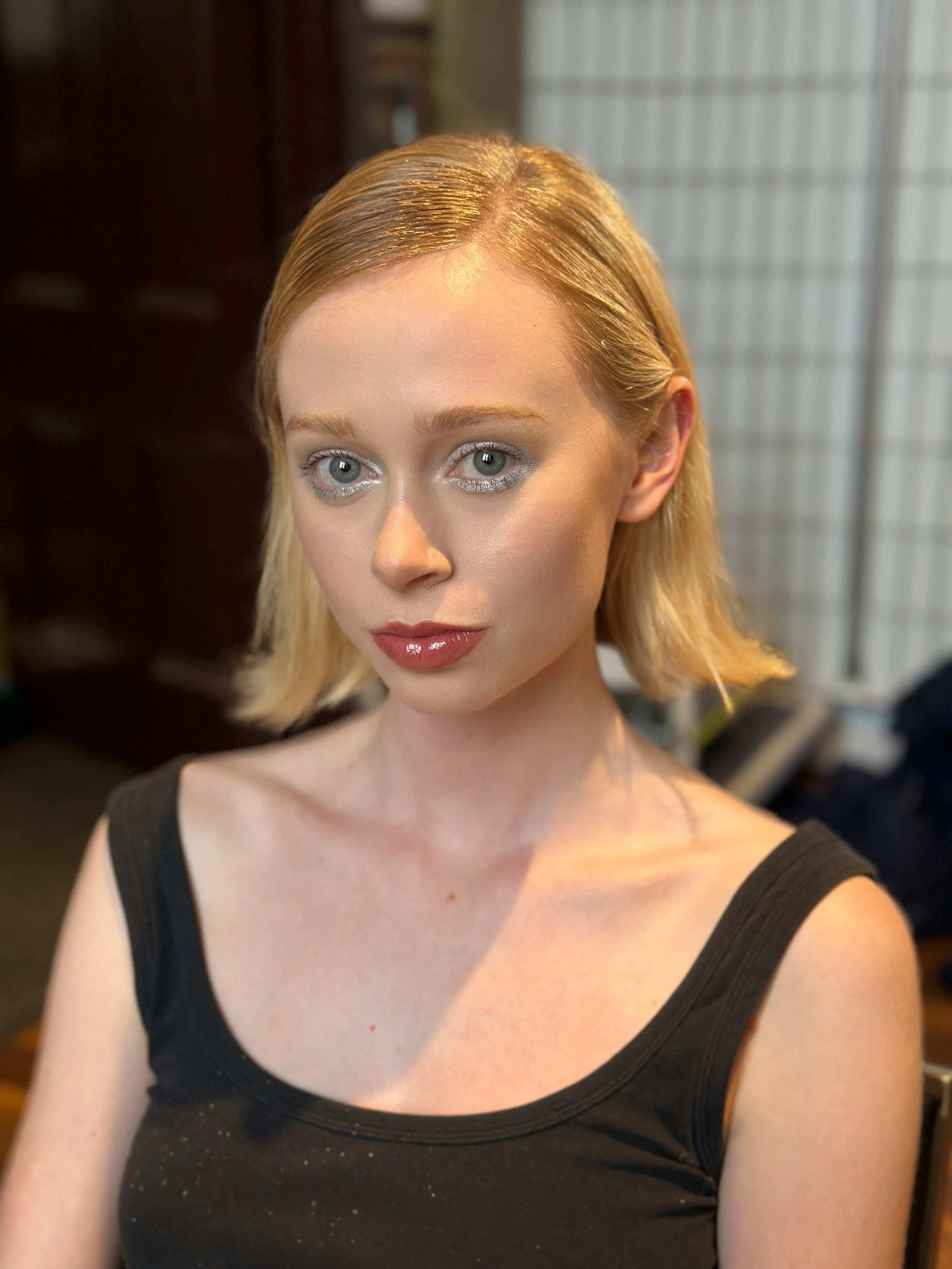 A young woman with short, sleek, wet-looking black hair styled in defined waves, wearing makeup with shimmering silver accents around her eyes, and dressed in a black T-shirt.