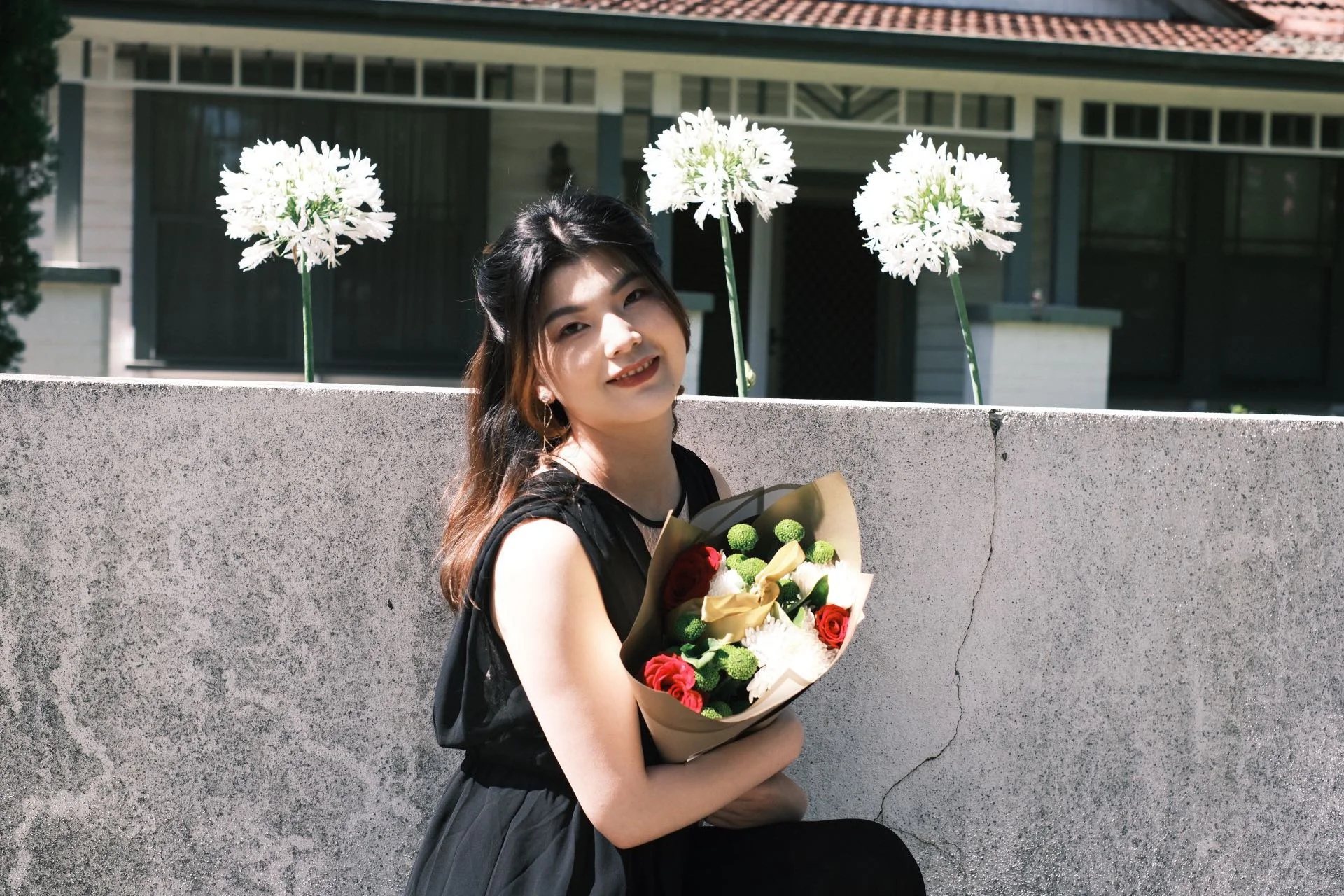 Young woman sitting outside with a black dress, holding a bouquet of flowers with red roses, white flowers, and greenery, smiling at the camera.