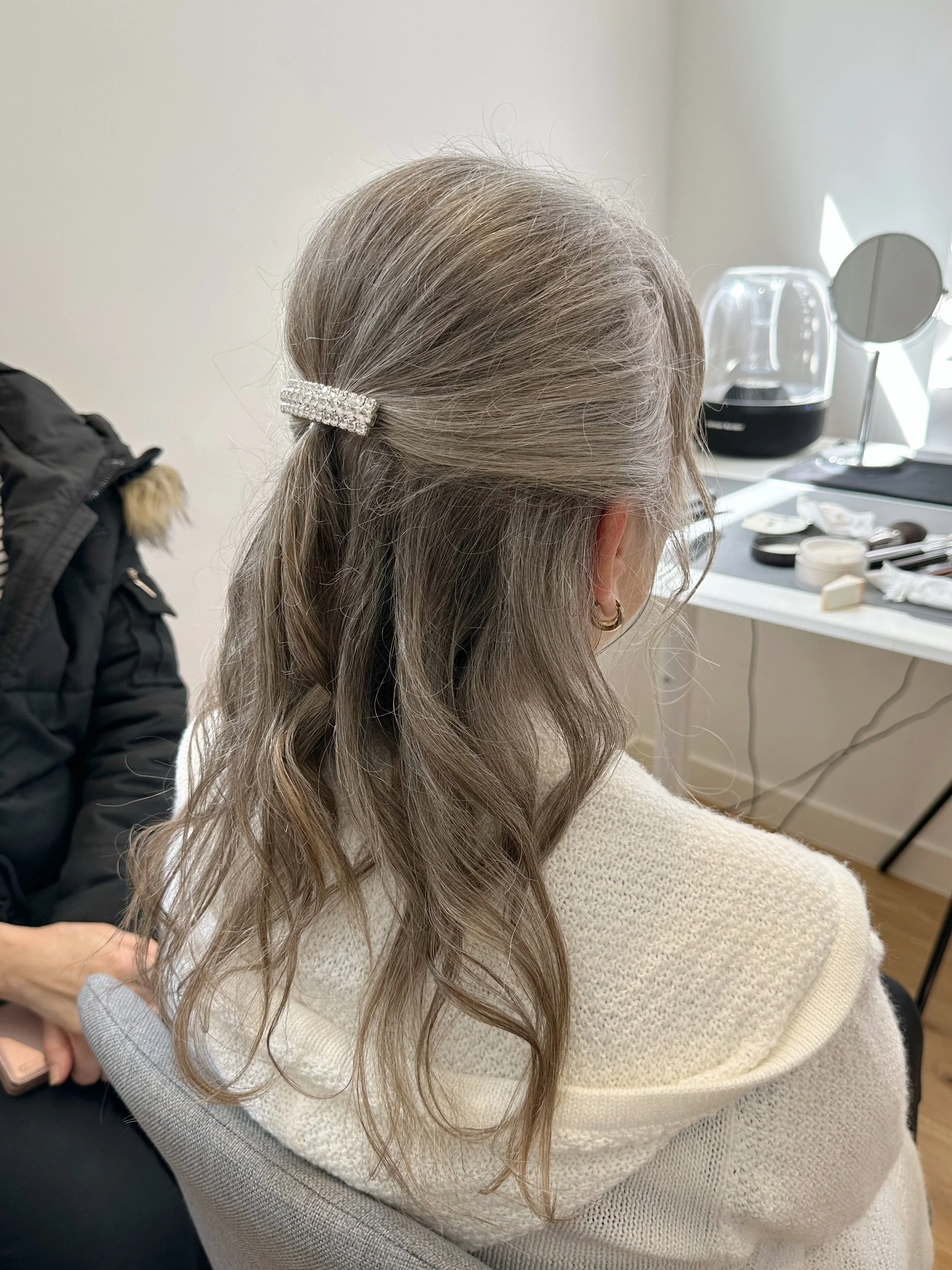 A woman with long gray wavy hair, secured with a pearl-embellished hair clip, sitting in a room with makeup and skincare products on a nearby table.
