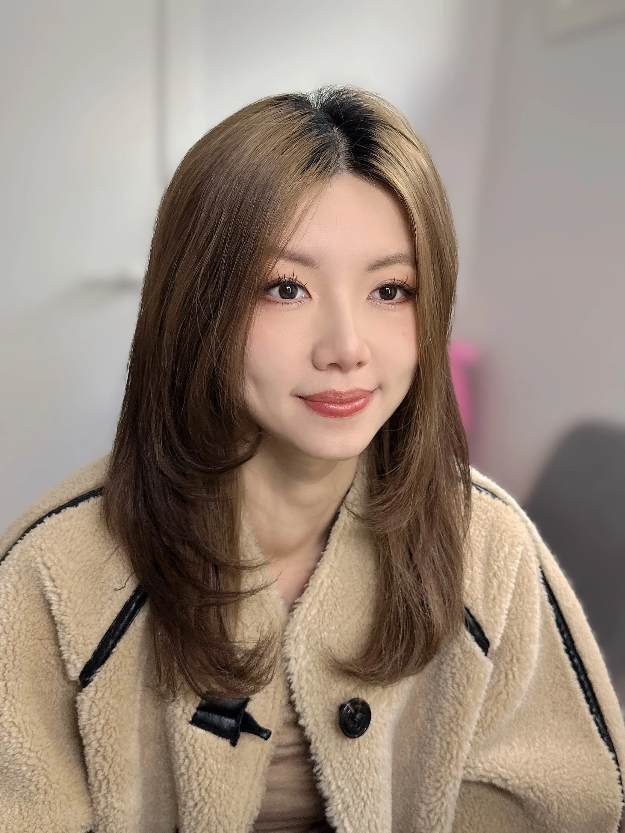 A woman with brown hair clipped back, sitting in a makeup chair, wearing a black cape, in a salon or makeup studio.